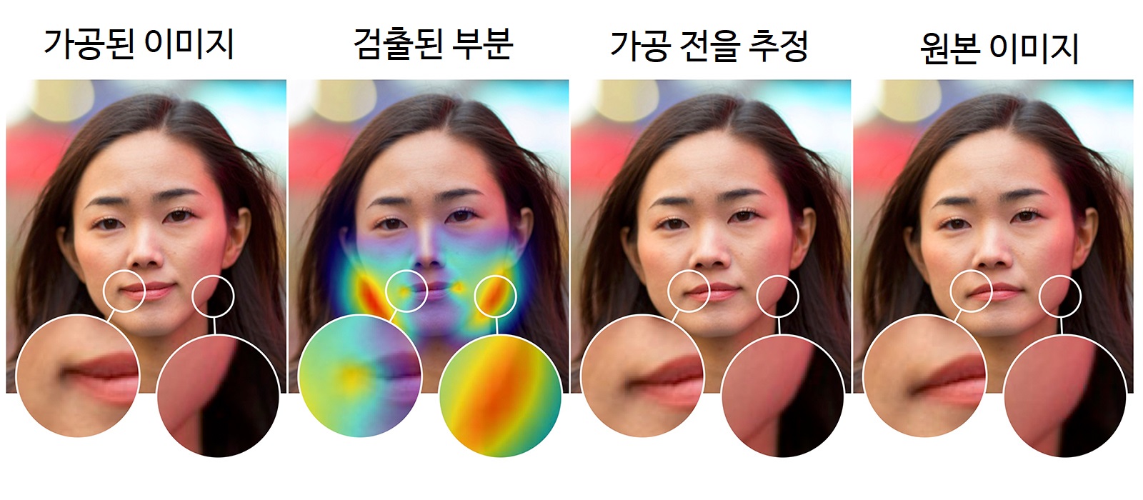 이미지의 예는 왼쪽에서 가공한 이미지, 감지된 가공 부분과 왜곡의 강도를 바탕으로 AI가 "복원"이미지, 진짜 원본 이미지 순입니다. 100% 완벽한 복원에는 성공하지 못했지만 꽤 높은 정밀도입니다.