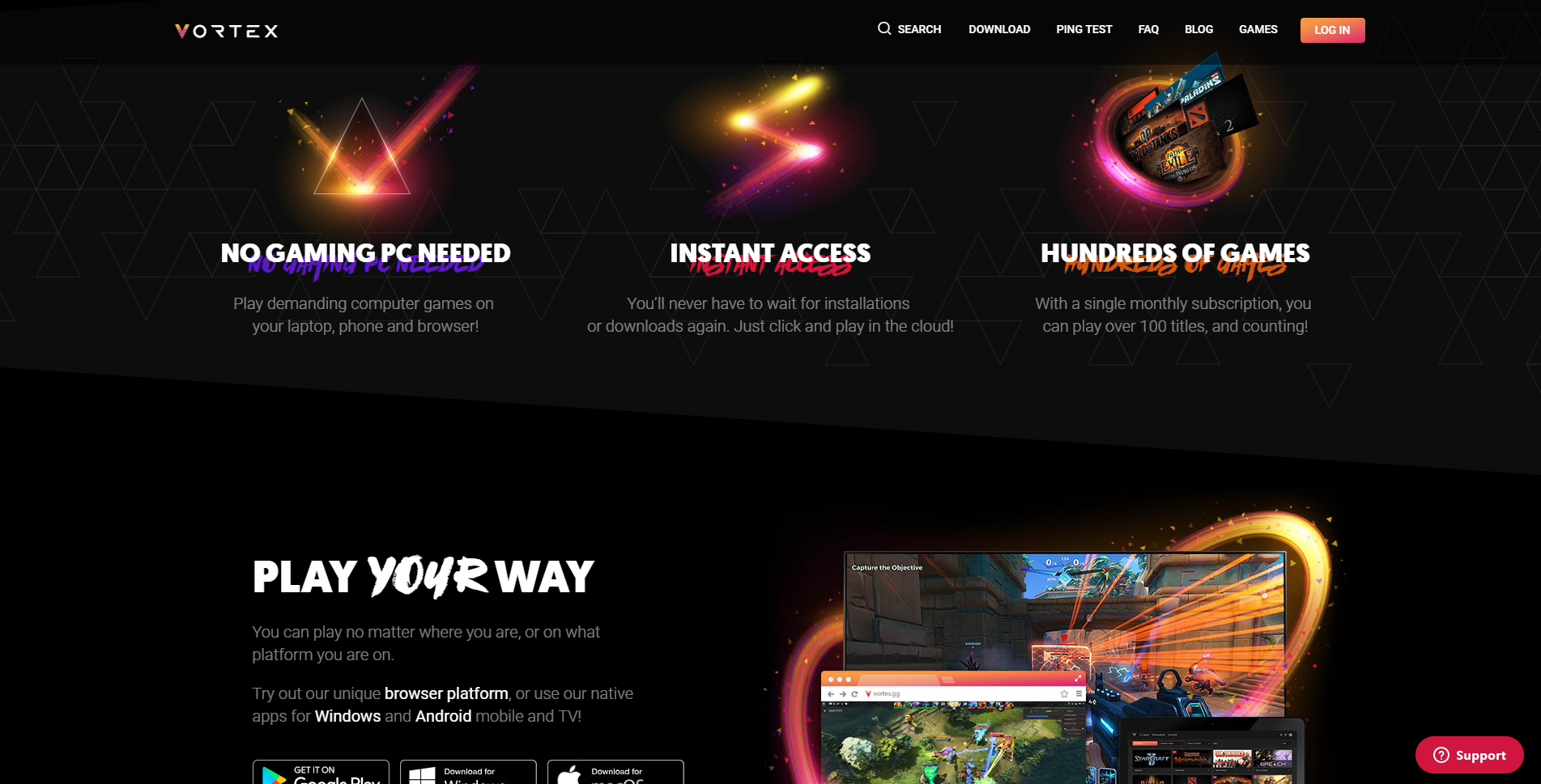 볼텍스의 최대 강점은 모바일 및 웹 브라우저 게임 스트리밍 기능입니다. 볼텍스 앱을 통해 스마트폰이나 태블릿에서 PC 게임을 즐길 수 있고, 다양한 유형의 기기에서 웹브라우저를 통해 게임을 플레이 할 수도 있습니다.