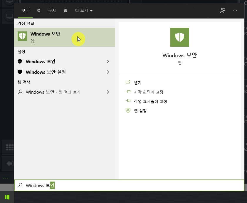 ❶ 윈도우 10 시작 단추를 클릭하고 Windows 보안을 입력한 다음 검색 결과를 클릭하여 실행합니다.