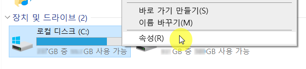 ❸ C 드라이브를 마우스 오른쪽 버튼으로 클릭하고 속성을 선택합니다.
