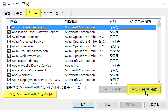 ❷ 서비스 탭으로 이동하여 모든 Microsoft 서비스 숨기기의 체크를 푼 후에 모두 사용 안 함을 클릭합니다.