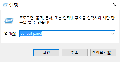 ❷ 윈도우 로고 + R 키를 누르고 control panel을 입력한 다음 엔터 키를 누릅니다.