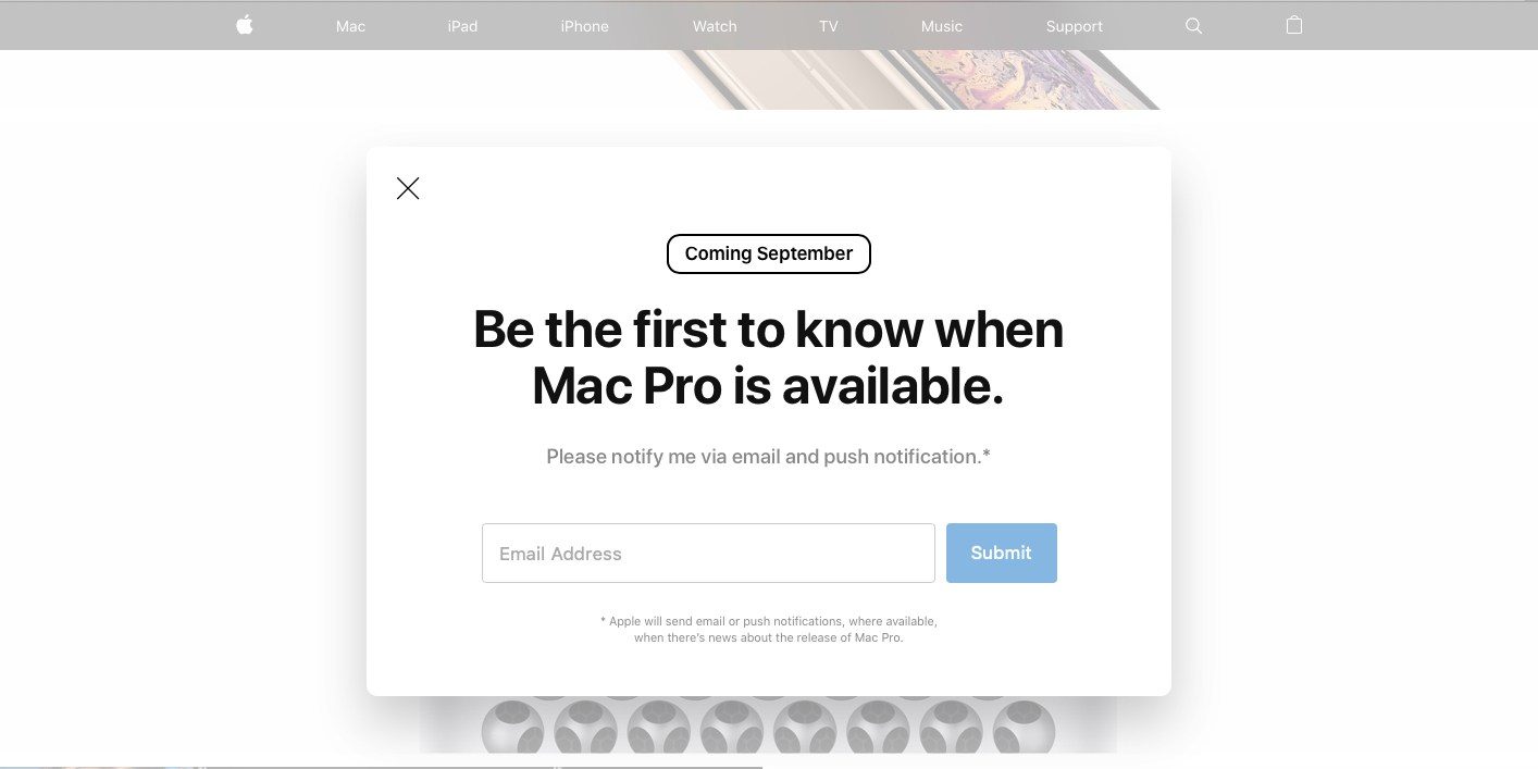 그러나 미 현지 애플 관련 정보 사이트 9to5mac에 따르면 미 현지 시간으로 6월 10일 경 애플 공식 사이트 첫 화면에 "Coming September(9월 출시)"라는 문구가 적혀 있었다고 합니다. 맥프로 부분에 있는 뉴스 통지 링크(Notify me)를 클릭하면 나타나는 팝업창 내에 해당 문구가 적혀 있었으며 9to5mac에도 해당 스크린샷이 게재되어 있습니다.