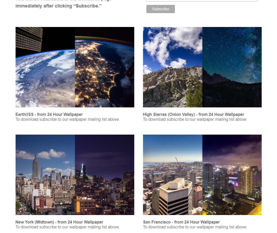젯슨 크리에이티브에서는 네 종류의 다이내믹 배경화면을 제공하고 있습니다. 하나씩 살펴보면 샌프란시스코의 24시간 변화 모습을 담은 배경 화면, 우주 정거장에서 바라본 지구의 모습, 하이 시에라 지역의 풍경, 뉴욕 맨해튼 중심지의 24시간 변화 모습을 담은 배경화면이 있습니다.