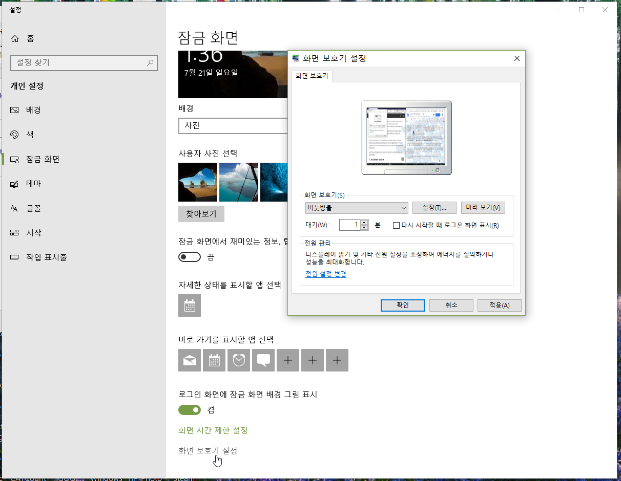 화면 보호기 설정 창이 하나 열리죠. 이 곳에서 화면 보호기를 변경할 수 있고 몇 분 뒤에 표시할지와 화면 보호기를 빠져나갈 시 로그인 창을 표시할지 여부도 선택할 수 있습니다.
