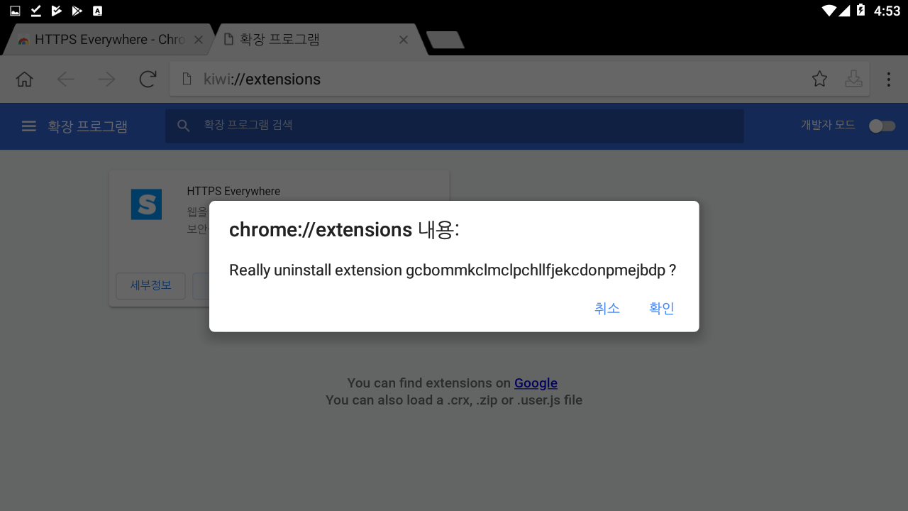 키위 브라우저 앱이 확장 프로그램을 줄 것인지 묻는 창을 표시합니다. 확인 버튼을 눌러 삭제하거나 취소 버튼을 눌러 바로 취소할 수 있습니다.