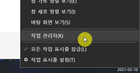 ❶ 윈도우 10의 작업 표시줄을 마우스 오른쪽 버튼으로 클릭하고 작업 관리자를 선택합니다.