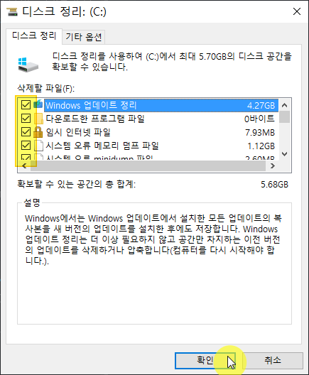 윈도우의 디스크 정리 유틸리티를 사용할 수도 있습니다.