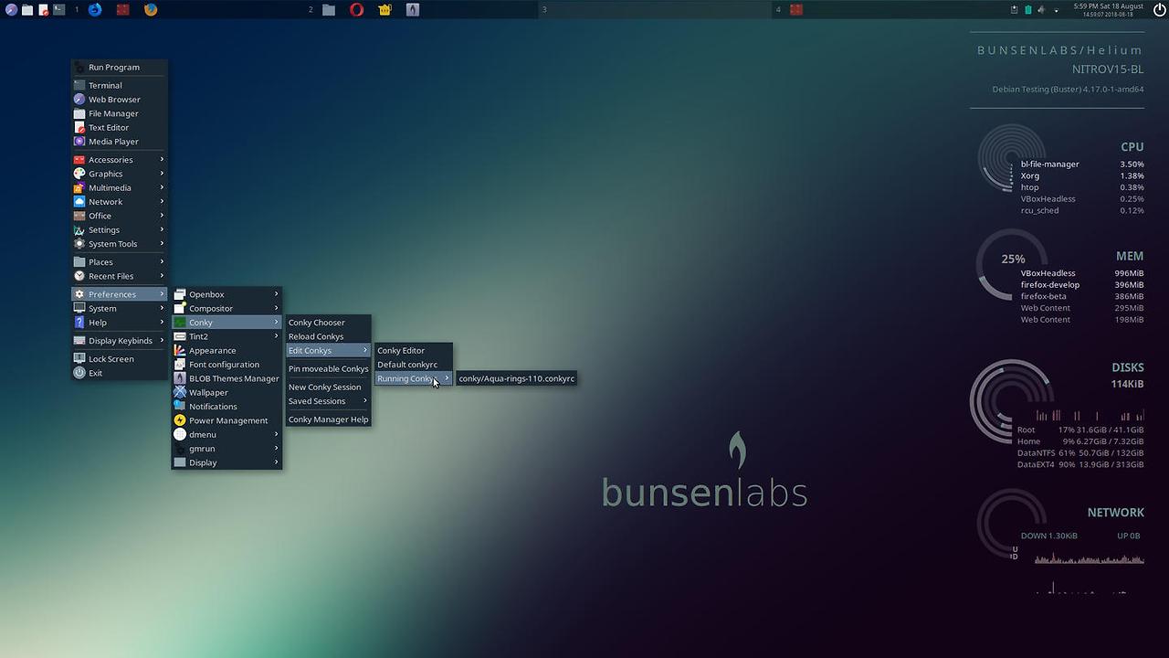 BunsenLabs는 Debian 11을 기반으로 하고 Openbox 윈도우 매니저를 사용하는 CrunchBang의 후속작입니다. 성능과 미적 균형 사이의 완벽한 조화를 제공합니다. 사전 설치된 애플리케이션과 데스크탑 환경은 매력적이며, 일상 사용에도 쾌적한 경험을 선사합니다. 설정이 용이하며, 반응성이 뛰어나 구형 컴퓨터와 최신 기기 모두에 완벽하게 맞습니다.